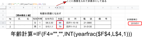 老人会の名簿の整理を行った。私の担当地域は76名ですがとりあえず入力は完了しましたが、年齢計算式を設定しておかないと来年また78人分の年齢を入力しなければならない。そこで計算式を設定することにした。